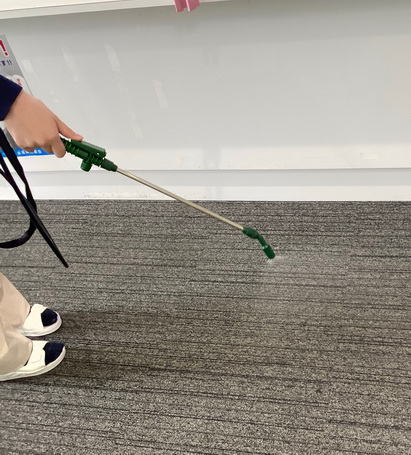 眼科では、患者の顔、まぶたなどに触れて検査することが多いため、接触するたびに機械消毒、手指消毒を行います。椅子、机、などは1日2回、絨毯(床)は、1日1回消毒作業を行います。
